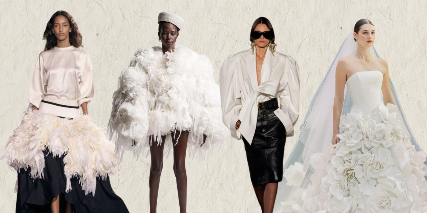 More is more. Designers leaned into drama this season with exaggerated sleeves, sculptural silhouettes and unapologetic grand-ness. In Paris, Chanel and Vaillant led the charge with gowns filled with feathery textures. Saint Laurent brought big shoulders and oversized bows, and the Nicole + Felicia catwalk in New York reintroduced the theatrically proportioned 3D florals for a whimsical look.