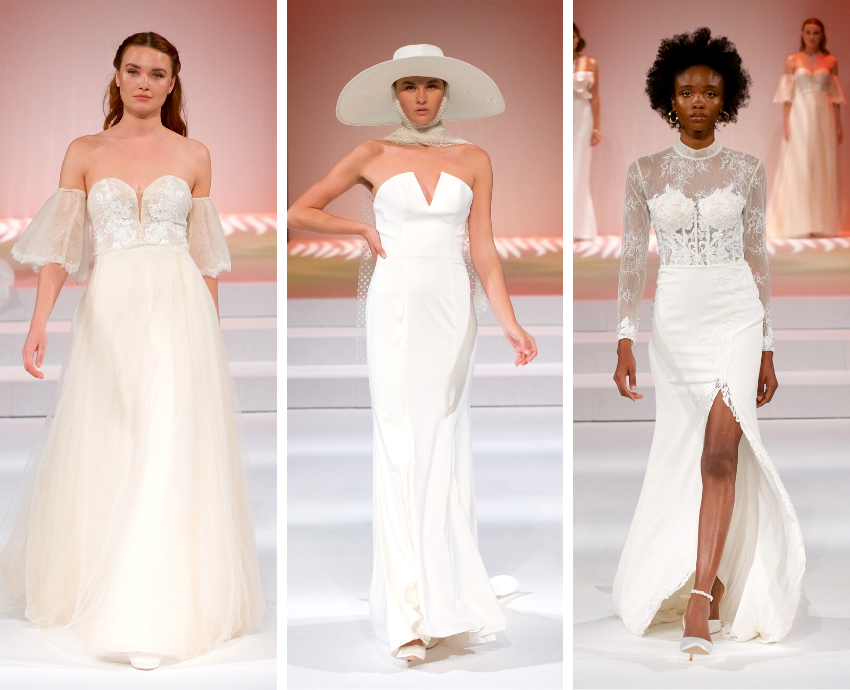 The runway from GAIA and Believe by GAIA at this year’s Harrogate Bridal Show was full of romantic dresses that focused on flattering the feminine figure whilst incorporating a range of shades and different styles of lace. From chic and simple gowns to intricately designed patterns, there is something for every bride. There were a variety of different types of sleeves used, including sheer fitted long-sleeves, drop sleeves, and even detachable sleeves. Structured bodices were often accompanied by ruffled sweetheart necklines, adding softness to the boned bodice. This collection felt sexy but graceful, with romantic touches added to figure-flattering gowns.